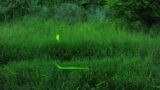 地面の草の中で光を放つ蛍の夜のマクロ写真