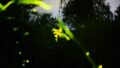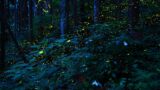 暗い森の前で飛び交う蛍の光跡が幻想的な風景